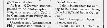 Questions or comments regarding this site? webmaster@cool.ca Website design, development and management: Perception reEngneering and Design Group. Copyright 1997 Cool to be Canadian. All rights reserved. Cool to be Canadian is a non-profit, non-partisan corporation.